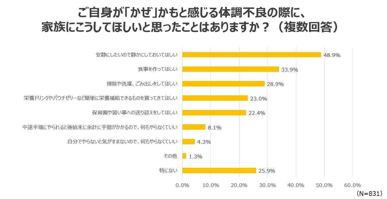 これまで、「かぜ」かもと感じる体調不良の際に“行うこと”や“困ったこと”、また、“日ごろの備え”について伺ってきましたが、続いては家族への要望について伺いました。