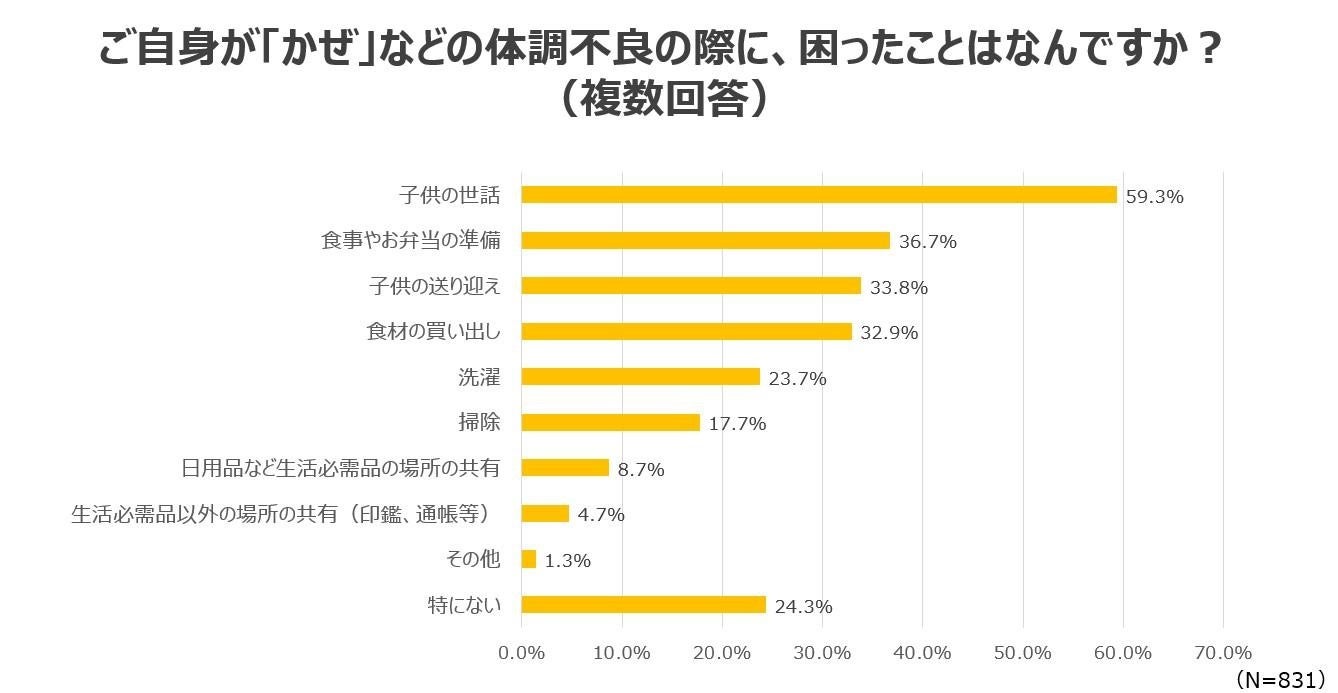 ~子育て中のママ・パパに「かぜなど体調不良時の困りごと」調査を実施~ ママ・パパが「かぜ」などの体調不良の際、実際に困ったことTop3は「子供の世話」、「食事やお弁当の準備」、「子供の送り迎え」