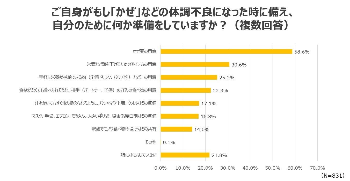 4. 「かぜ」などの体調不良になった時に備えて準備しているものは「かぜ薬」が約6割でダントツ1位(家族のため61.5%、自分のため58.6%)。一方、何も準備していないという人も一定数いることが判明