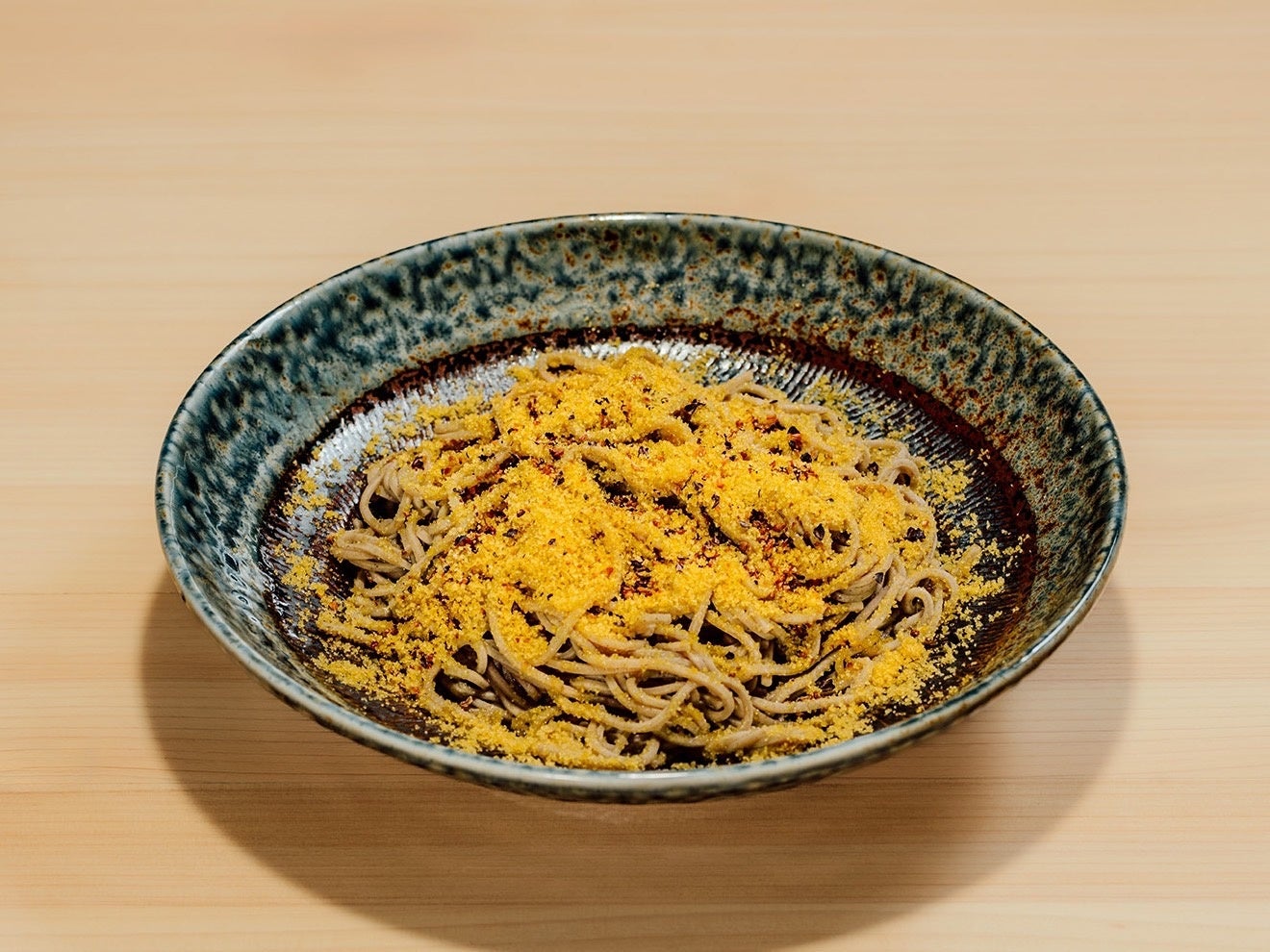 「からすみ蕎麦というフレーズが粋だと思うんですよ。蕎麦もからすみも日本の伝統食のイメージが強いので、粋をテーマにしたこの店にはふさわしいかなと。からすみ蕎麦って安い居酒屋でも出していますけど、そういうとこに行かないと食べる機会がないんです。王道の蕎麦屋では、逆にこういうアレンジはできないので。レシピ的に言うと蕎麦にからすみをかけただけですけど、韃靼蕎麦茶を入れて香ばしさを出しています、実は。そういう “実は” はけっこうあります、うちは。油も米油しか使っていませんし、鮭も脂ギッシュなノルウェーサーモンじゃなくて天然紅鮭にこだわっていますし」