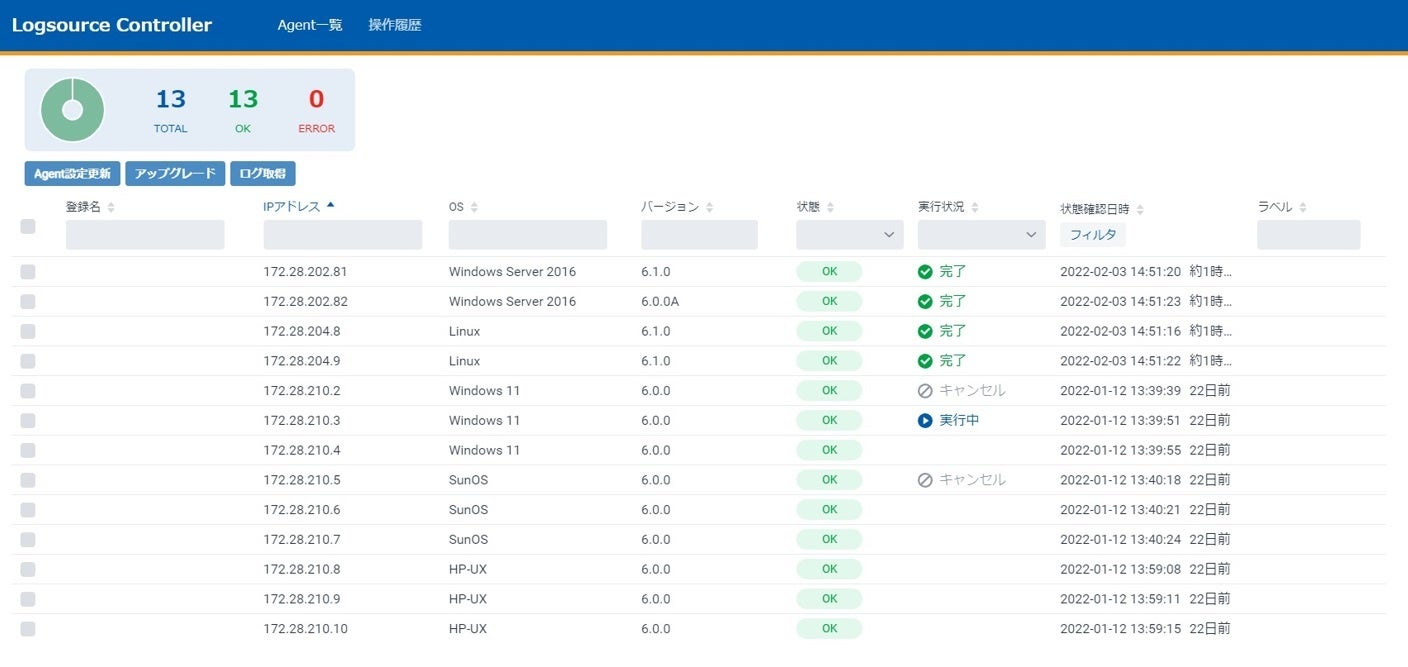 ログの収集対象機器に設置するプログラム(エージェント)の情報を、GUIで一括管理できるツールが