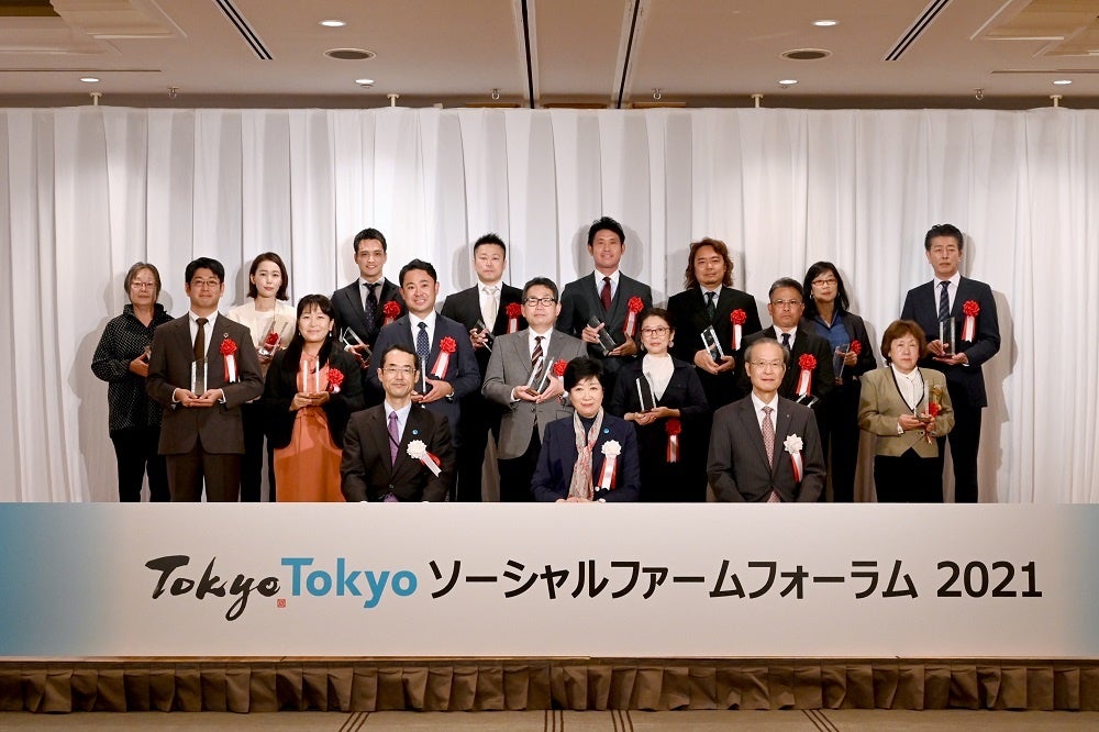 小池百合子東京都知事より授与。(東京都撮影・上段右から3番目が代表取締役大倉伸三)