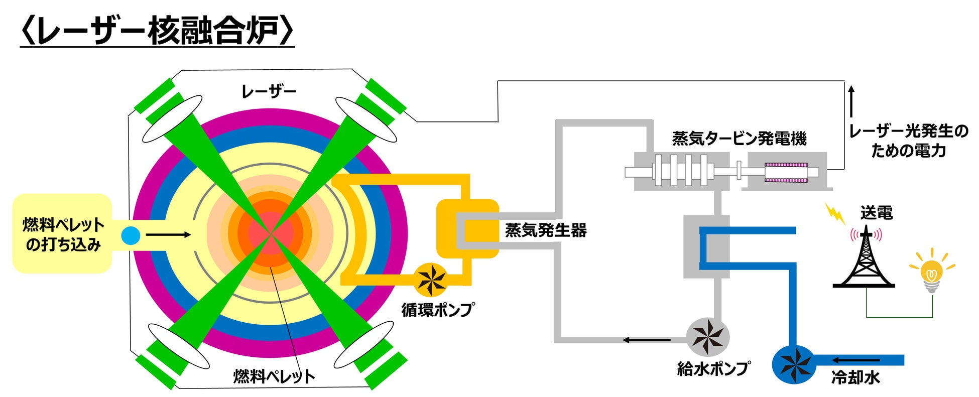 レーザー核融合は高出力レーザーを用いて重水素と三重水素の混合物を高密度に圧縮すると共に、高温度に加熱することで、核融合反応を起こし、エネルギーを得る手法です。日本を始め、米国、仏国、英国、中国、ロシアを中心に研究が行われています。米国では、2021年8月、ローレンス・リバモア国立研究所の国立点火施設 (NIF)の実験において、レーザー投入エネルギーの7割を超える核融合出力1.35メガジュールが達成されました [1]。これは、レーザー方式で核融合燃料を点火燃焼させることが可能であることを実証したものです。
