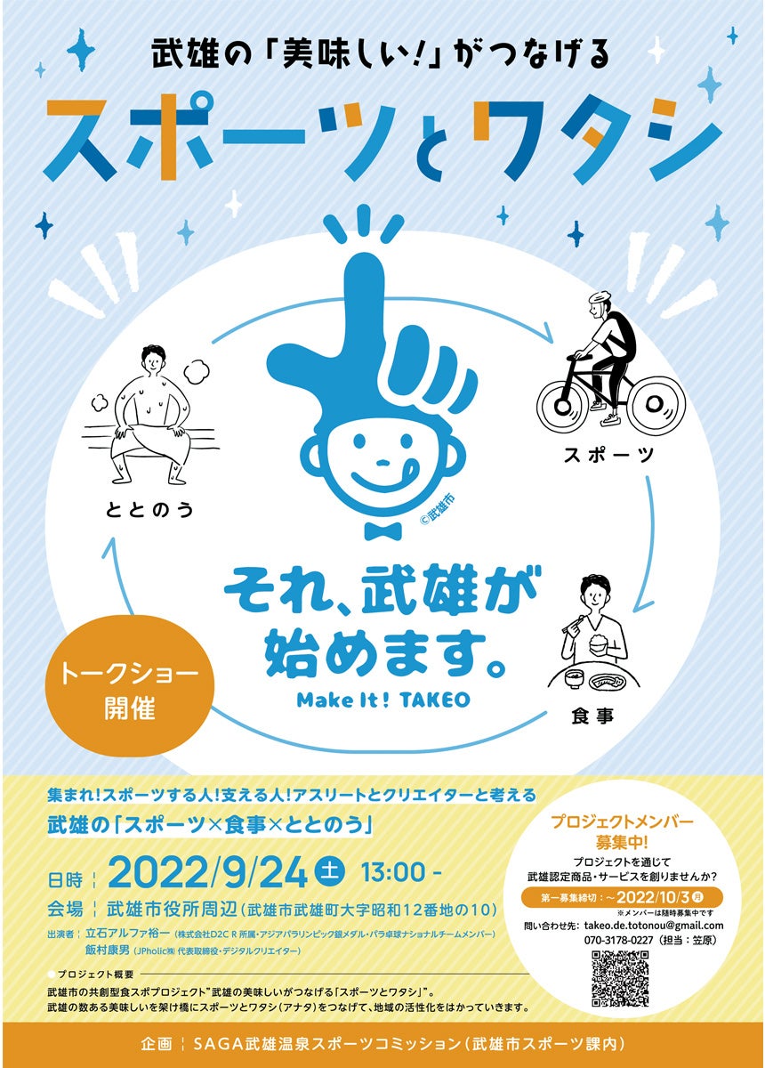 | イベント名 | 集まれ!スポーツする人!支える人! アスリートとクリエイターと考える武雄の「スポーツ×食事×ととのう」 |