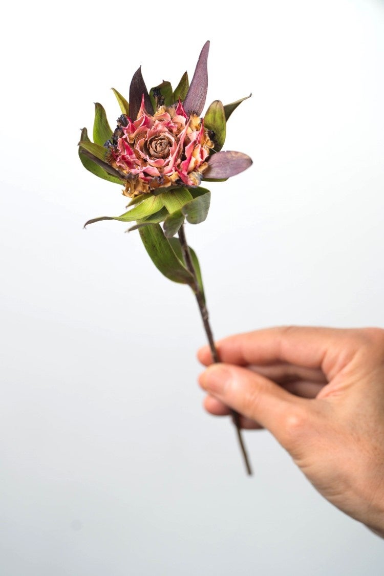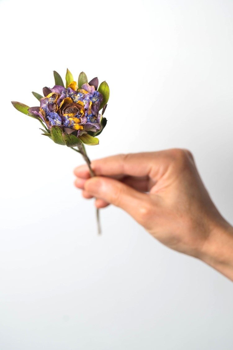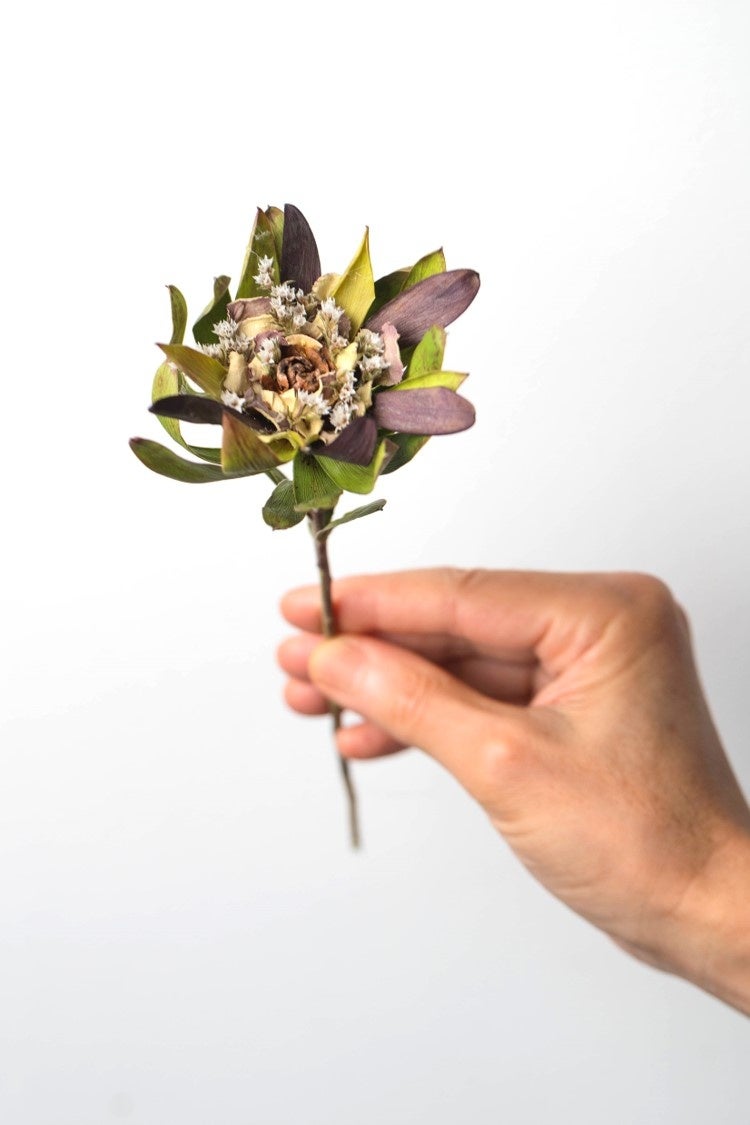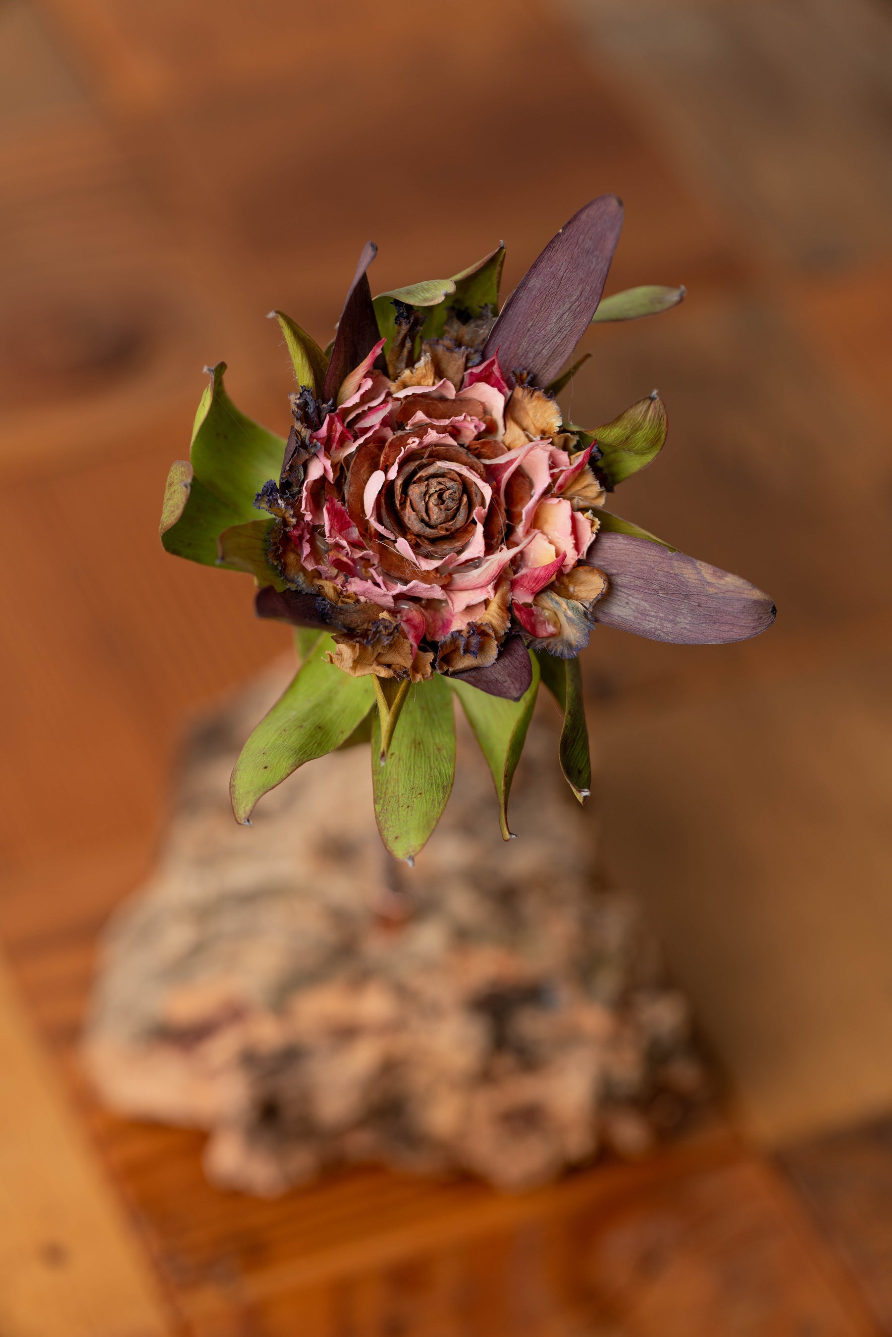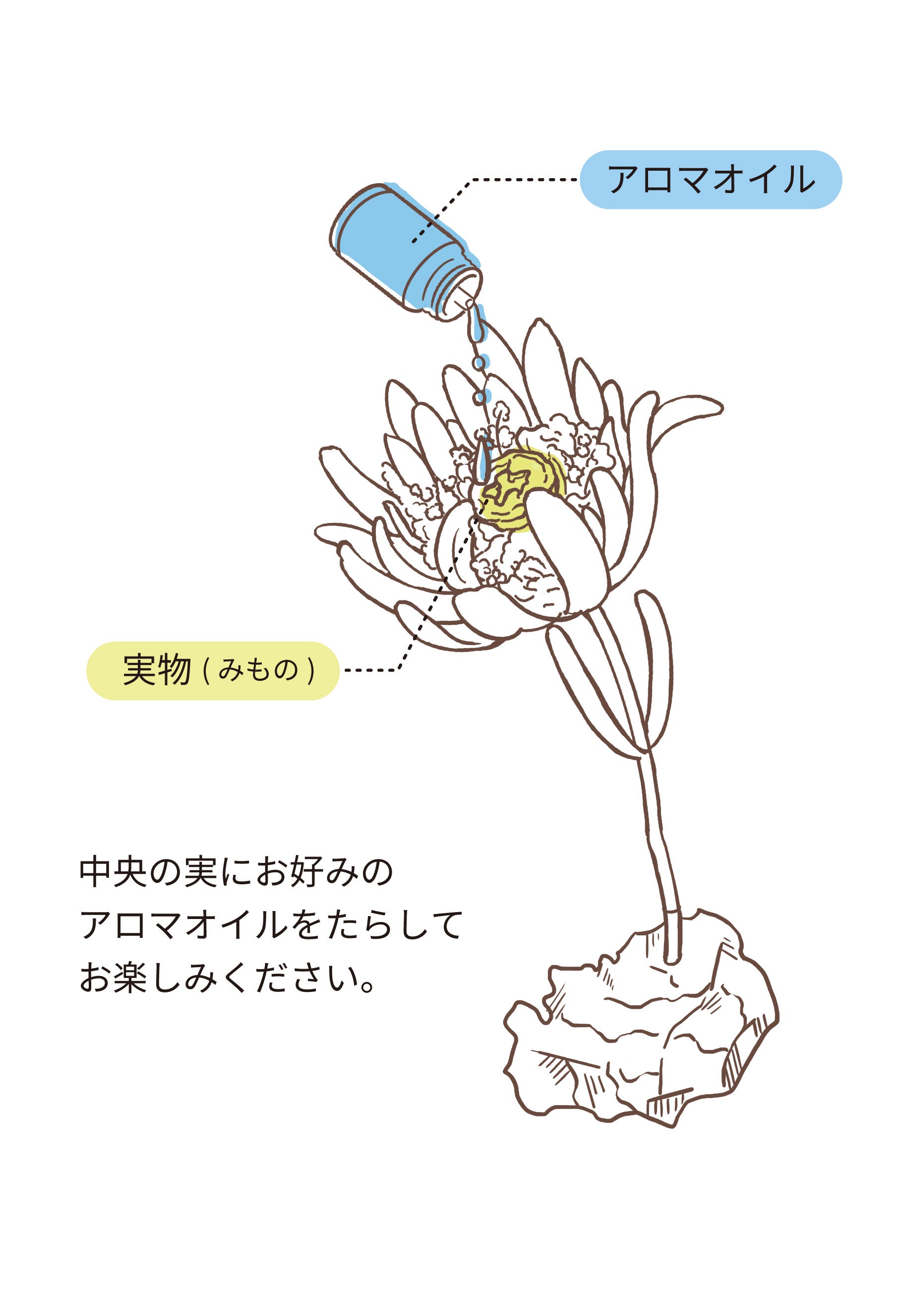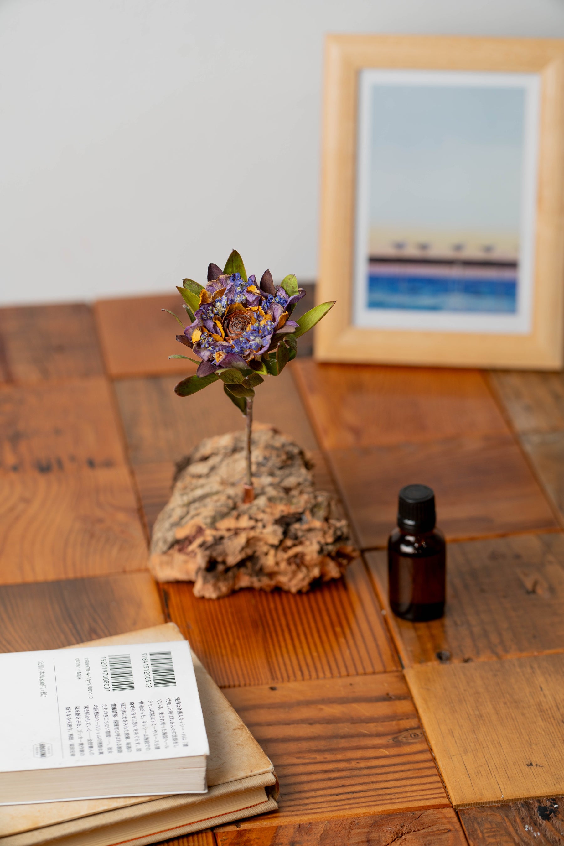 花の種類だけでなく、規格外や店舗廃棄花材、剪定ゴミといった、それぞれの置かれた環境や物語が異なる花材を集め、この世には存在しない一輪の花として構築。湿気に弱いドライフラワーですが、アロマオイルを滴下する受口に実物(みもの)を活用することでデュフューザーとして利用できる仕様にしました。