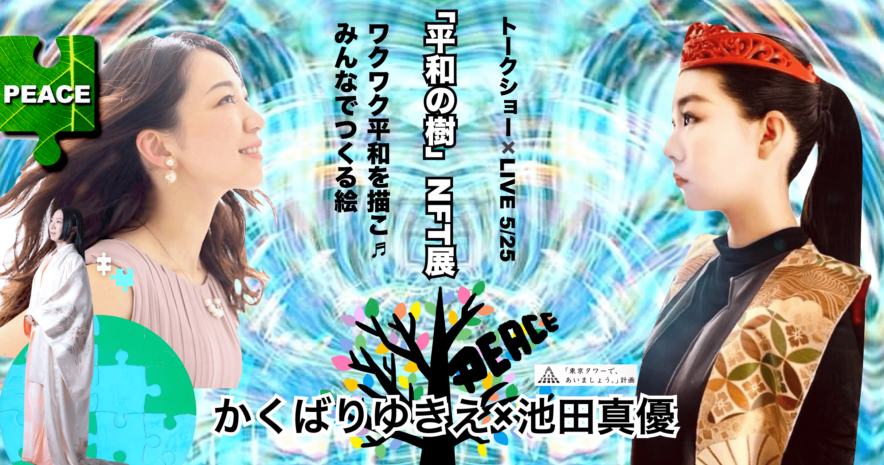 バーチャルをリアルに繋げるNFTの新しい可能性を切り拓く取り組み。現代アーティスト池田真優と、日本発の平和活動を行うHumming for PEACE代表・歌手のかくばりゆきえが企画・制作を担当。