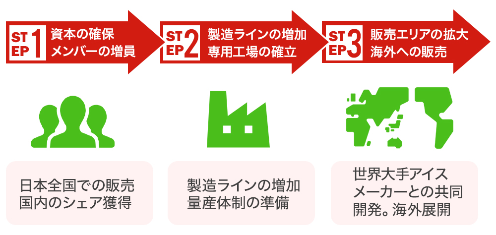 今後は、アイスクリーム以外でも活用用途を拡げ、事業を多角化してまいります。また、海外のアイスクリームメーカーとの共同開発も行い、販路を世界中に拡大することで企業として成長してまいります。