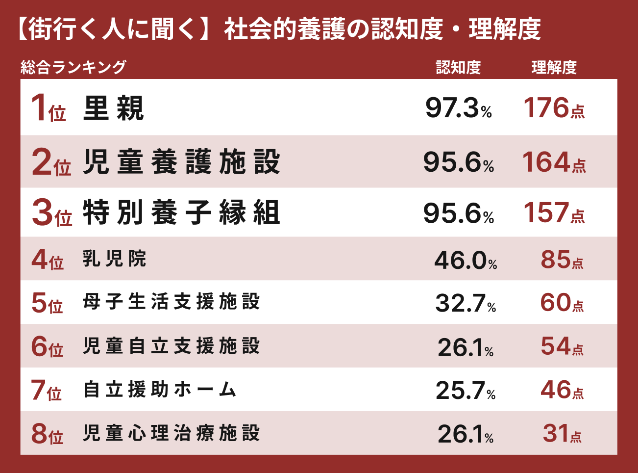 なかでも里親・児童養護施設・特別養子縁組の順で認知度が高く、