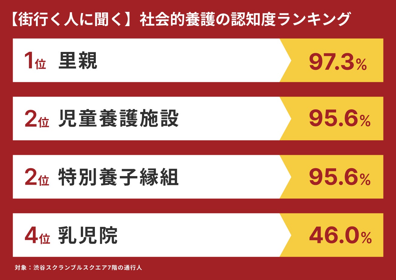 合同会社トンボ(東京都渋谷区神宮前 代表社員 吉住海斗)が運営する「ALLHOME」が渋谷の街ゆく人113人に社会的養護に関する認知度・理解度調査を行った。「里親」「児童養護施設」「特別養子縁組」が認知度トップ3であると明らかになった。