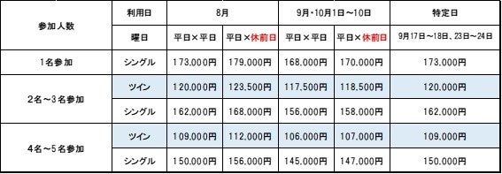 1名、4名~5名の場合/上記料金より、1名に付25,000円引きとなります。
