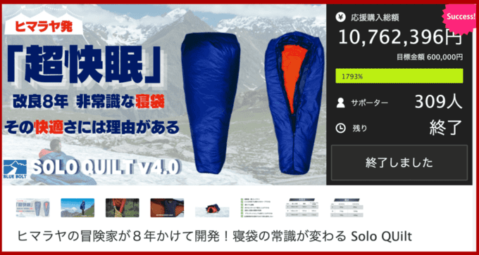 -20℃でも快眠!ヒマラヤの冒険家が快適を追求した寝袋「ソロキルト」を2月8日よりMAKUAKEにて予約販売開始