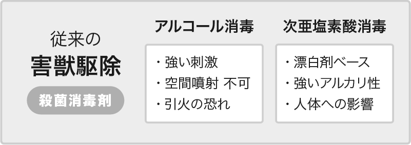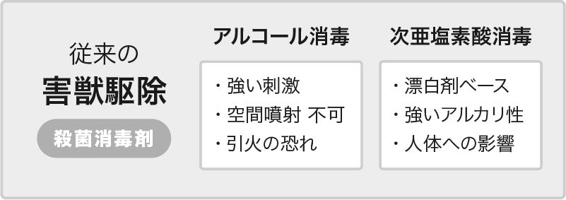 これにより、害獣駆除作業に欠かせない除菌作業での危険性をなくし、ご年配の方や、小さなお子様、ペットにも配慮した設計が実現できました。