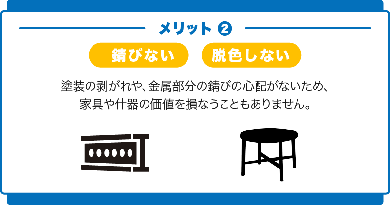 また、アルコール等とは異なり、錆や変色もないため什器や家具、建物を劣化させないのも特徴の一つです。