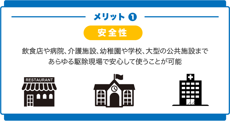 人体への安全性が高いことから、飲食店や病院、介護施設、幼稚園や学校、大型の公共施設まであらゆる駆除現場で安心して使うことができます。