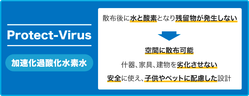 「Protect-Virus」は除菌・除ウイルス効果の高い過酸化水素をベースに界面活性剤、溶剤を配合し、より即効性を高めた「加速化過酸化水素」を主原料としており、短時間で細菌やウイルスを除去し、対象表面を衛生的に保つことができます。