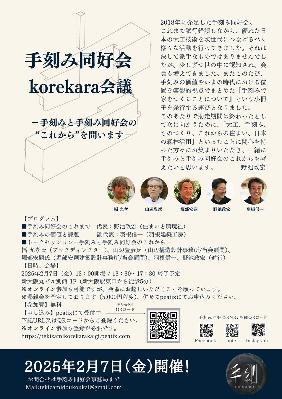 2018年に発足した手刻み同好会。これまで試行錯誤しながら、優れた日本の大工技術を次世代につなげるべく様々な活動を行ってきました。それは決して派手なものではありませんでしたが、少しずつ世の中に認知され、会員も増えてきました。またこのたび、手刻みの価値やいまの時代における位置を客観的視点でまとめた『手刻みで家をつくることについて』という小冊子を発行する運びとなりました。このあたりで助走期間は終わったとして次に向かうために、「大工、手刻み、ものづくり、これからの住まい、日本の森林活用」といったことに関心を持った方々にお集まりいただき、一緒に手刻みと手刻み同好会のこれからを考えたいと思います。 野池政宏