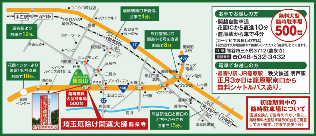 1200年の歴史を持ち、関東で唯一、厄除けと開運のご利益を同時にいただける「厄除け開運本山」の埼玉厄除け開運大師・龍泉寺。