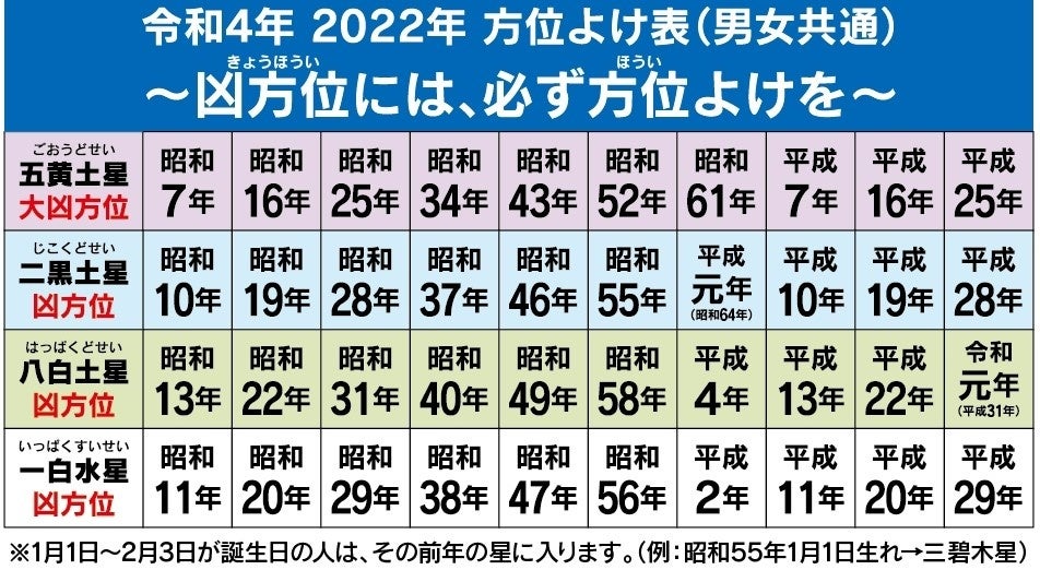 現代では厄年が注目されがちですが、凶方位も厄年と同じぐらい注意しなければいけない年です。下の早見表で凶方位に該当される方は、必ず方位除けをして災いのない一年にしましょう。