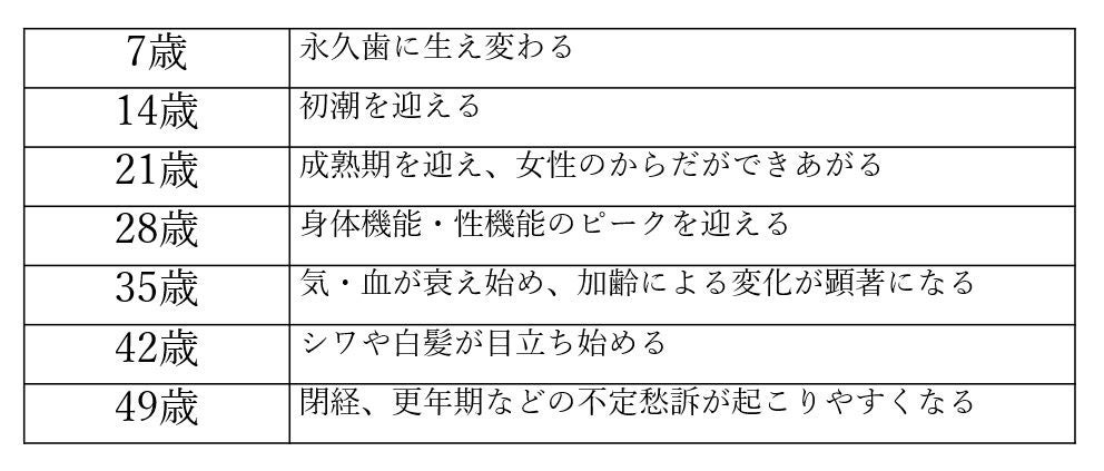 漢方では、体質や季節の巡りなどを日々自らと向き合って健康を養う「養生」のヒントとしますが、そのヒントとして「年齢」を参考にする考え方もあります。約2000年以上も前に書かれた書籍「黄帝内経(コウテイダイケイ)」に、「女性は7の倍数・男性は8の倍数の年齢を節目に体の変化が表れる」とした、身体の年齢変化・ライフスタイルに関する記述があります。個人差はありますが、自身の健康や体質を見つめなおすタイミング、自身の体調変化と節目にあった養生への取り組み方を知る機会として、今もなお漢方の世界では一つの目安として捉えられている考え方となります。