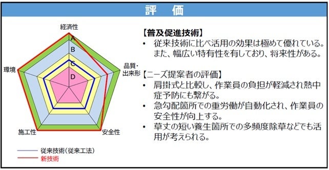 ユニック製リモコン式電動草刈機は、既定面積での草刈作業時間、出来栄えなどにおいて、従来技術であるエンジン駆動の刈払機に対する優位性が評価されました。5項目の評価尺度においては、経済性、安全性、施工性、環境の4項目でA評価(従来技術より極めて優れる)、品質・出来栄えでB評価(従来技術より優れる)となりました。最高評価である普及促進技術に指定されたことで、関東地方整備局発注工事などへの新技術としての導入が期待されます。