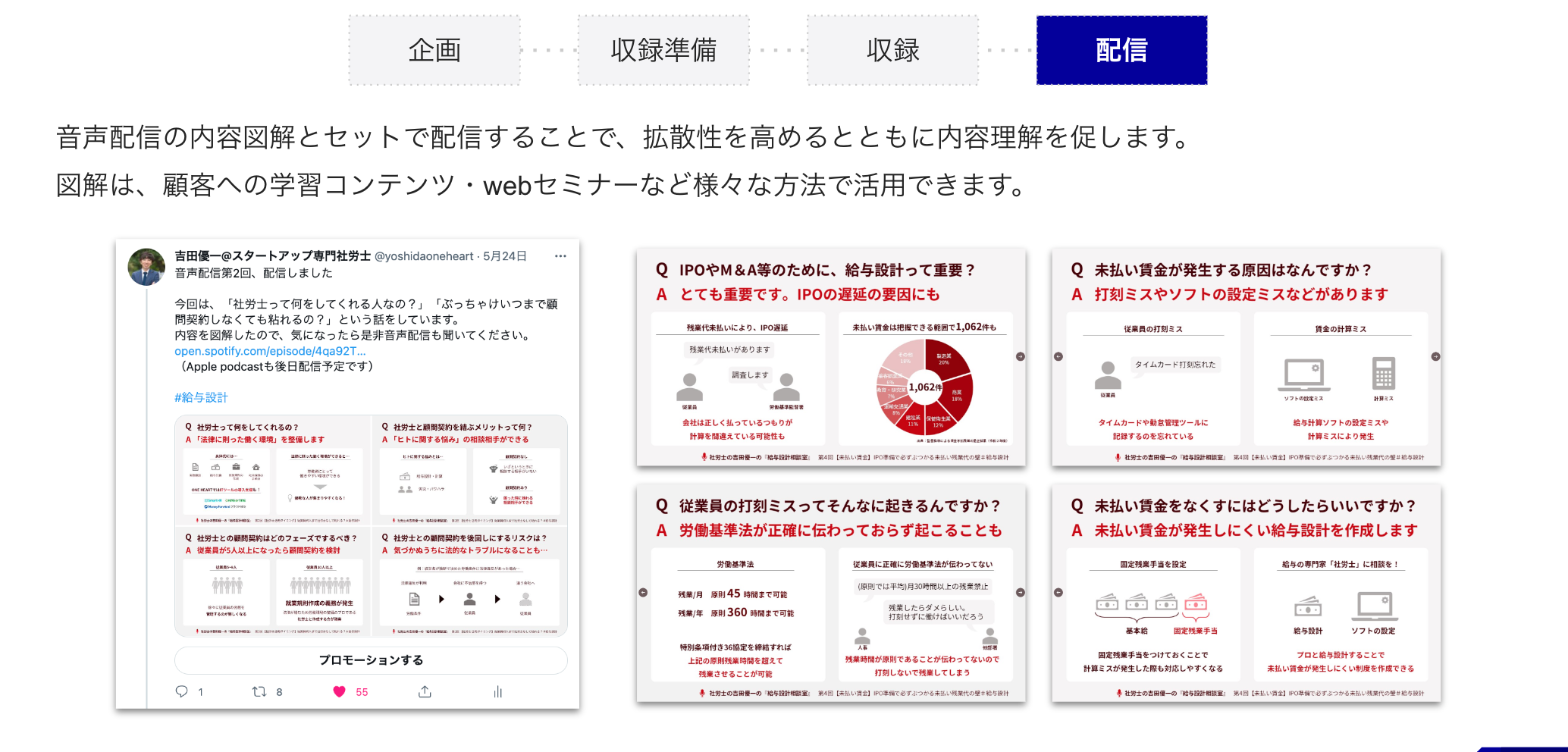 音声配信の立ち上げ時は細かな業務が発生するため、通常業務の合間に進めるのは困難です。スモールスタートでは一連のプロセスに全て伴走するため、毎月たった4時間程度の収録で継続的な音声配信を行えます。また、収録後は図解を作成してSNSでの発信を強化、より効果的に注目を集めるサポートも可能です。