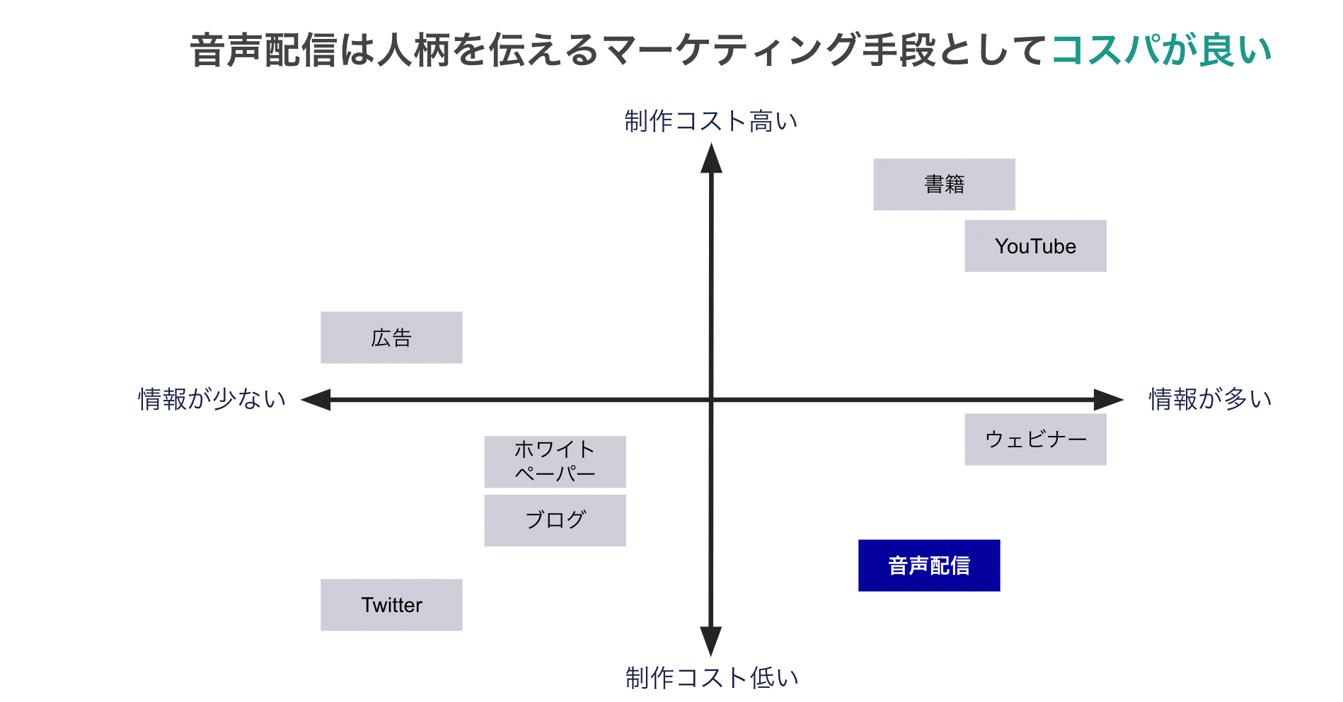 また、音声配信は採用・営業などにおいて、他の代替手段と比較し幾つかの強みを持ち合わせています。一つは「情報量が多く、制作コストが低い」点です。テキストではなく音による情報伝達のため、単純な情報のみならず細かなニュアンスをもって伝えることが可能となります。さらに、動画と比較して収録や編集作業が低い点も大きな利点と言えます。