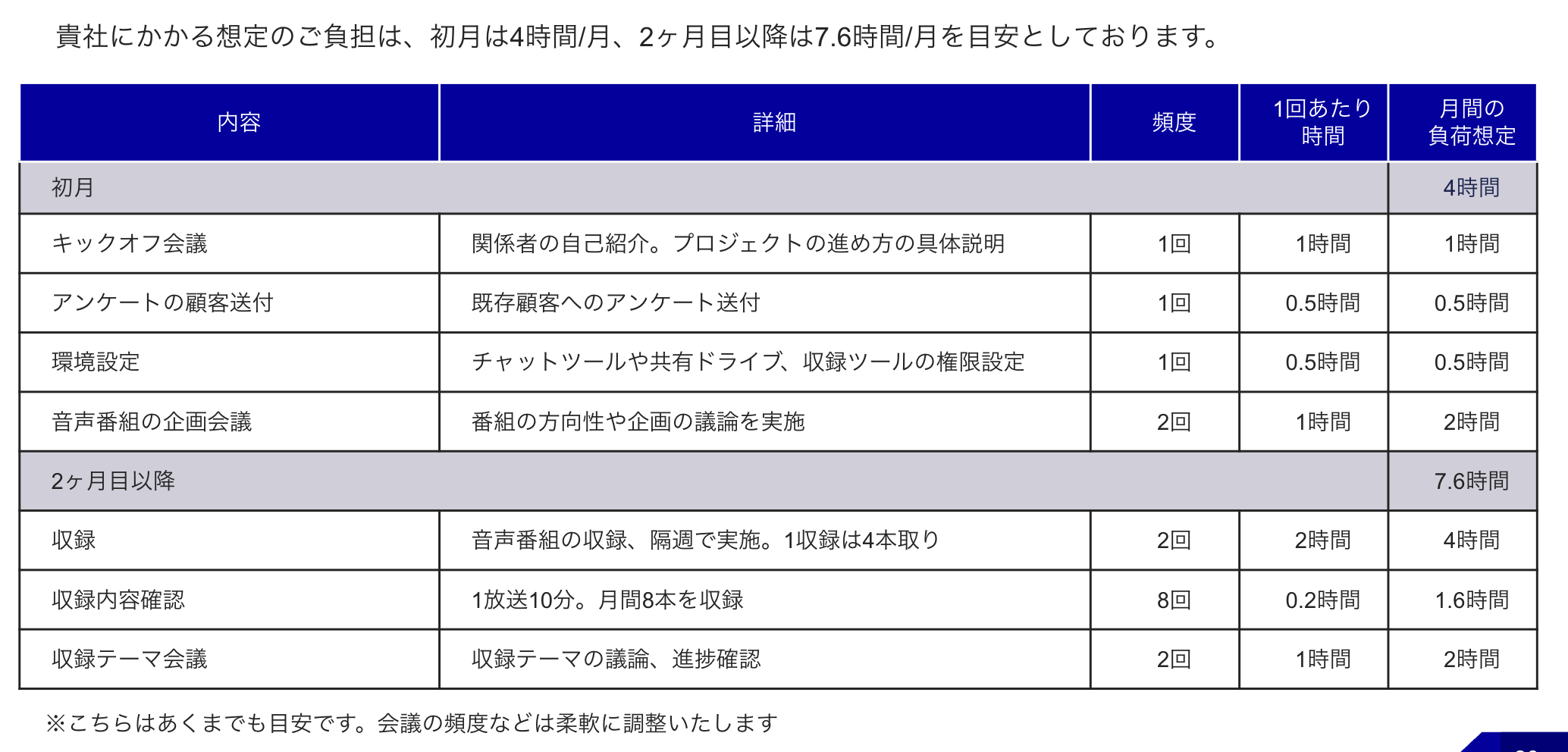 本サービスは合計4ヶ月の期間で計30本の音声配信を行います。最初の1ヶ月は調査、2ヶ月目から収録・配信開始です。伴走支援で作成する戦略資料、要点まとめスライドなどのアウトプットもそのままご提供します。