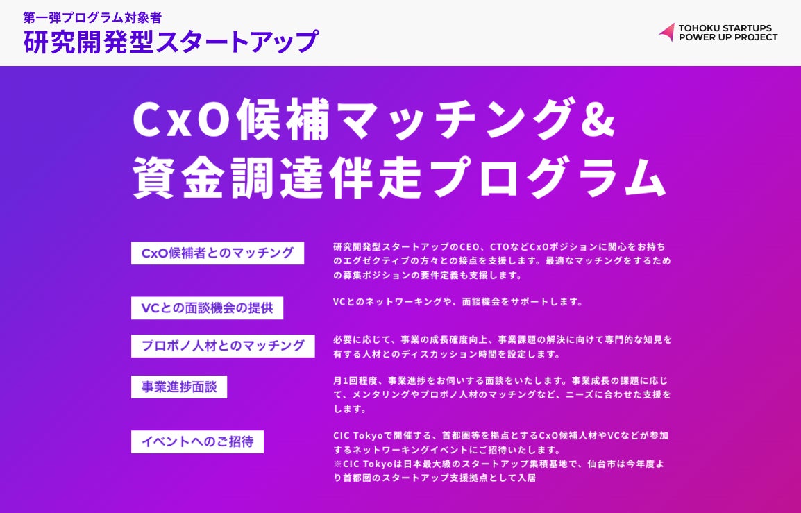 本プロジェクトでは、事業の成功確度向上に向けたCxO候補人材との交流、事業課題に関する専門家とのディスカッションや資金調達の相談機会などをご提供し、仙台・東北の起業家・スタートアップの事業推進を支援し、東北のスタートアップ・エコシステムを加速させてまいります。