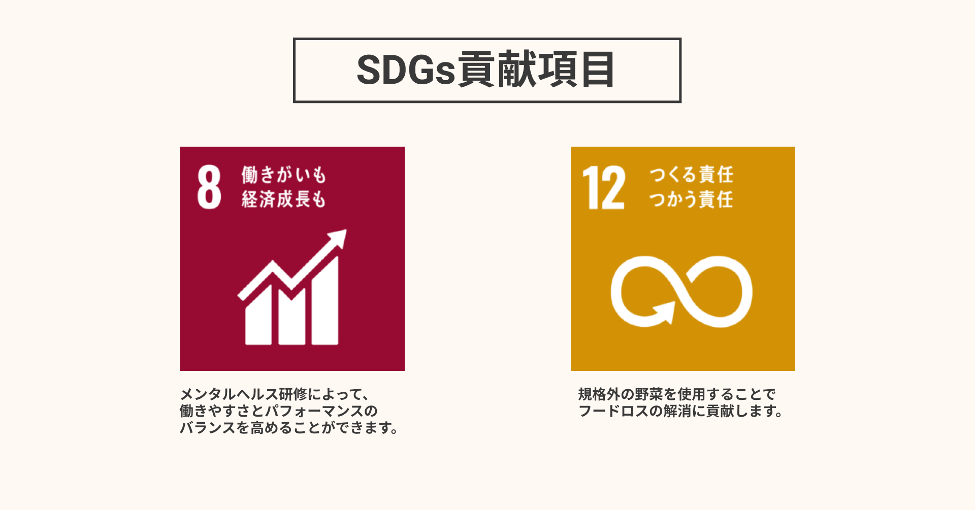 本研修をご利用いただくことでSDGsの達成に貢献します。メンタルヘルス研修を実施することで従業員の方の満足度の向上、うつ病など精神疾患の予防など「8.働きがいも 経済成長も」の達成をサポートします。また規格外野菜を使用することでフードロスを解消し「12.つくる責任 つかう責任」に貢献します。