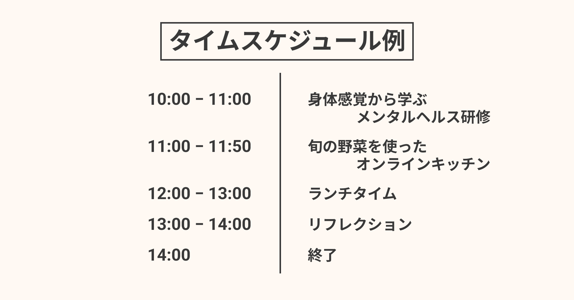 メンタルヘルスに関するワークショップでは基礎知識だけでなく、野菜を使い素材そのものを五感で味わいながらメンタルヘルスの個別性(一人ひとり異なること)などを身体的に理解していきます。オンラインキッチンでは新鮮な野菜を使って参加者全員で調理を行い、完成後はランチトークを通して相互理解を深めていきます。最後に研修の内容を仕事に還すためのリフレクションを行います。