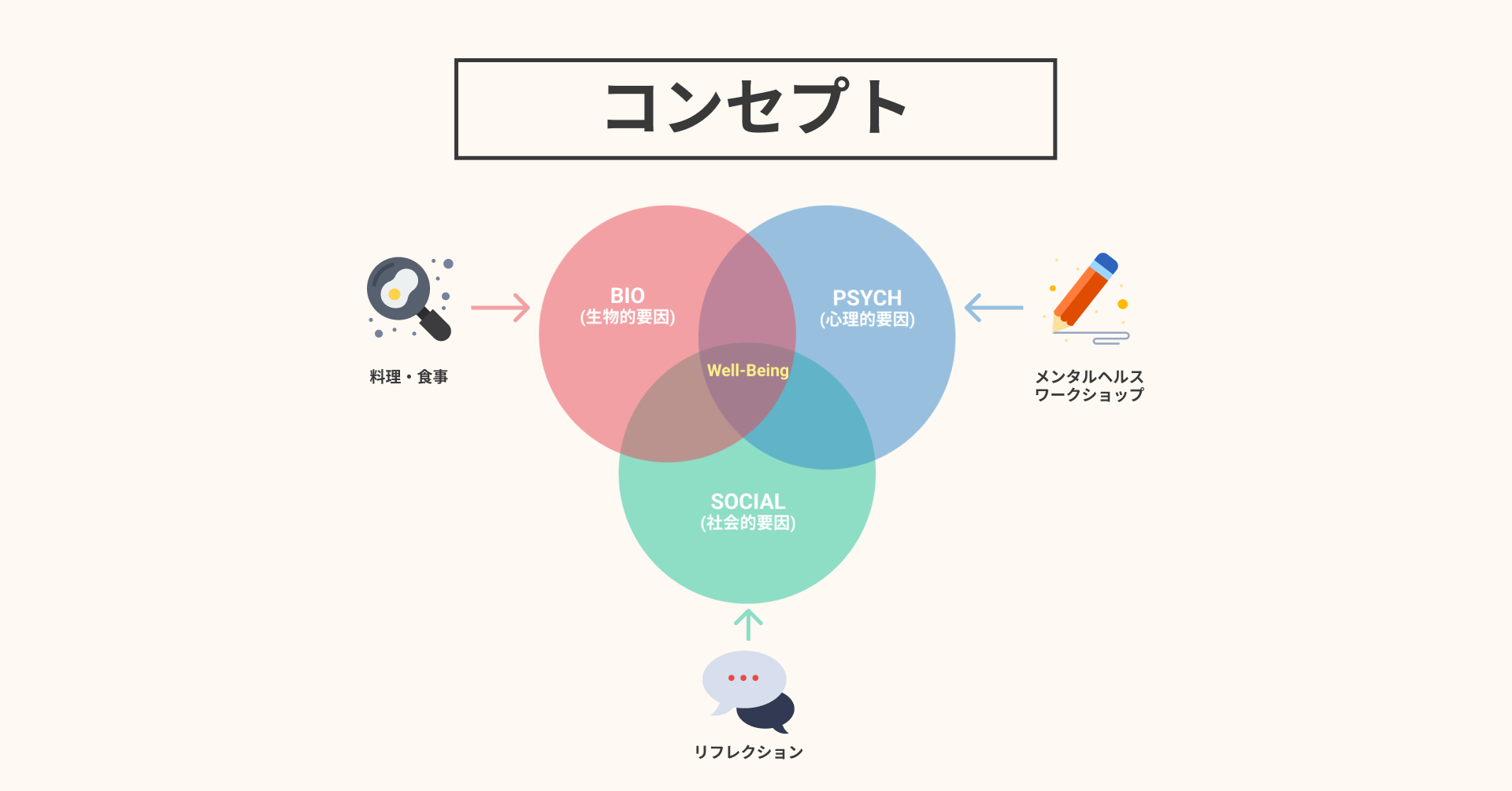 そうした情勢を受けて本研修プログラムではより包括的なメンタルヘルスの問題の予防・解決を目指しました。具体的には生物的要因/心理的要因/社会的要因からメンタルヘルスを捉えるBPSモデルを参考に、ワークショップ、料理・食事、リフレクションがそれぞれの要因にアプローチする設計になっています。単なる知識ではなく一人ひとりの感覚を通して文字通り「身になる」研修となっています。