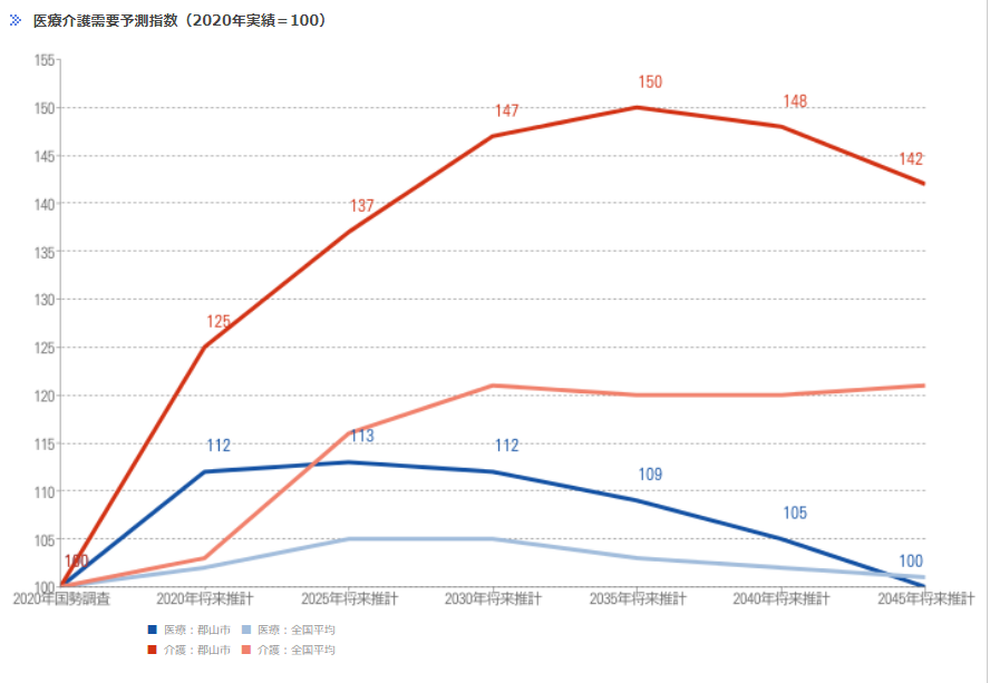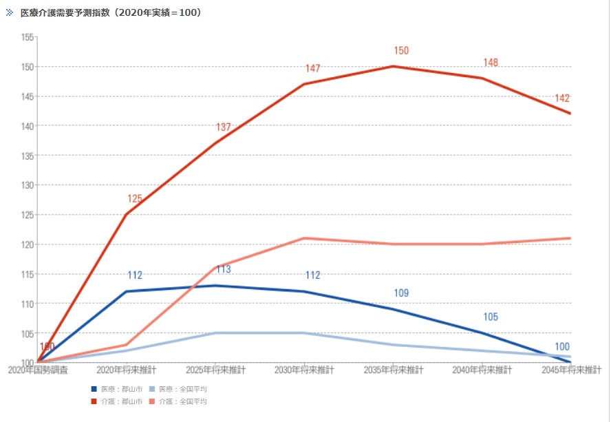 郡山市では、2020年時点では、65歳以上の高齢者が12万8,463人であるのに対し、2035年には17万2,868人になると見込まれています。それに伴い、医療介護需要予測指数(※1)は、介護が2035年には150(全国平均120)、医療が109(全国平均103)となる見込みです。特に介護のニーズにおいては、ピーク時で全国平均と1.5倍の開きが出ることが予測されています。