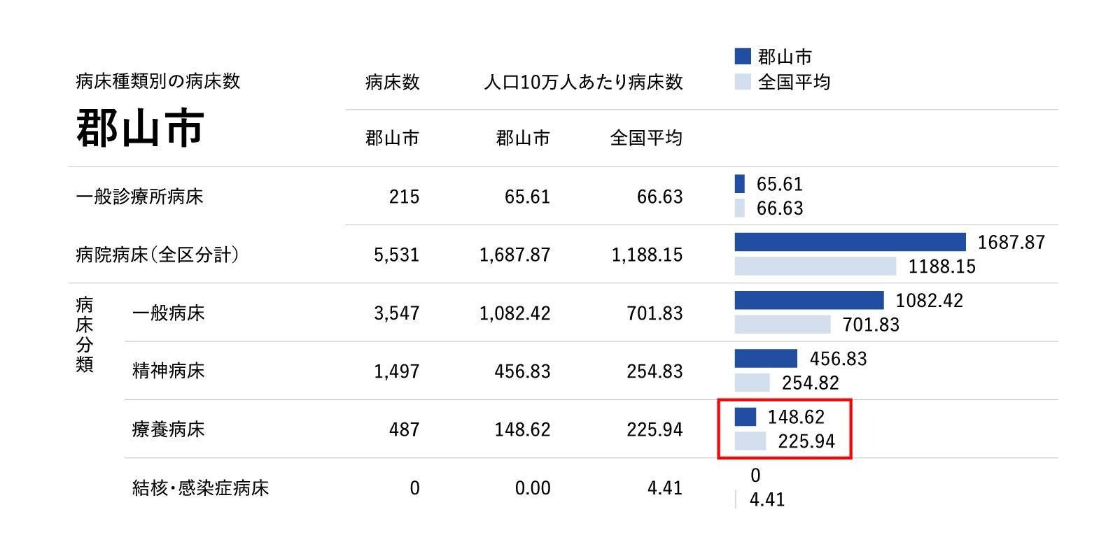 ところが、郡山市の療養病床数は全国平均に比べて低い水準です。人口10万人当たりの病床数が全国平均の225.94に対し、郡山市は148.62に留まっています。