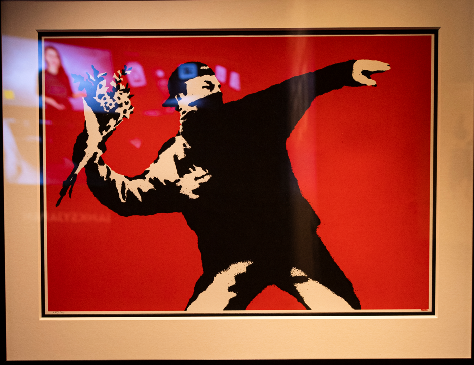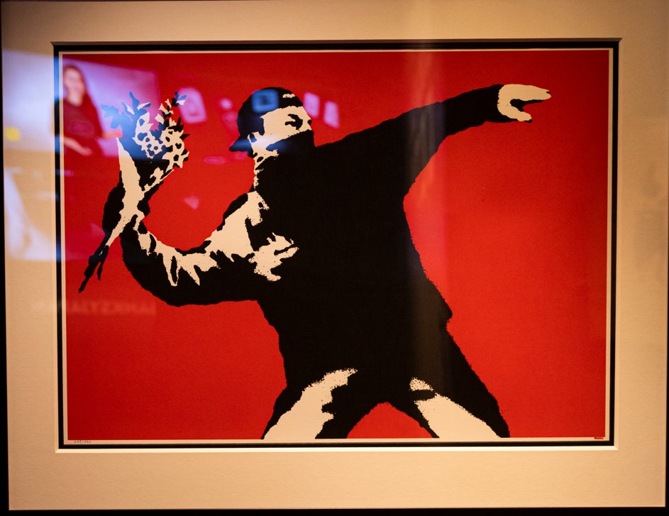 ベースボールキャップを反対に被る暴徒がバンダナで顔を隠し、火炎瓶の代わりに花束を投げる様子を描いた作品。元はパレスチナとイスラエルを分断する分離壁が建設された際、「この分離壁のせいで、パレスチナは世界最大の野外刑務所になった」とバンクシーが制作。火炎瓶の代わりに花束を持った男性の姿