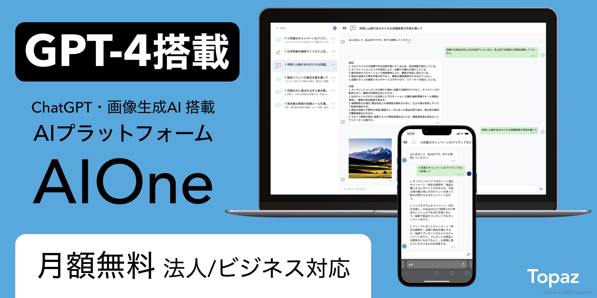 Topaz合同会社は、2023年3月18日(土)より画期的なAIプラットフォーム「AIOne」で提供中のOpenAI社GPT-4を利用回数無制限で期間限定無料提供します。