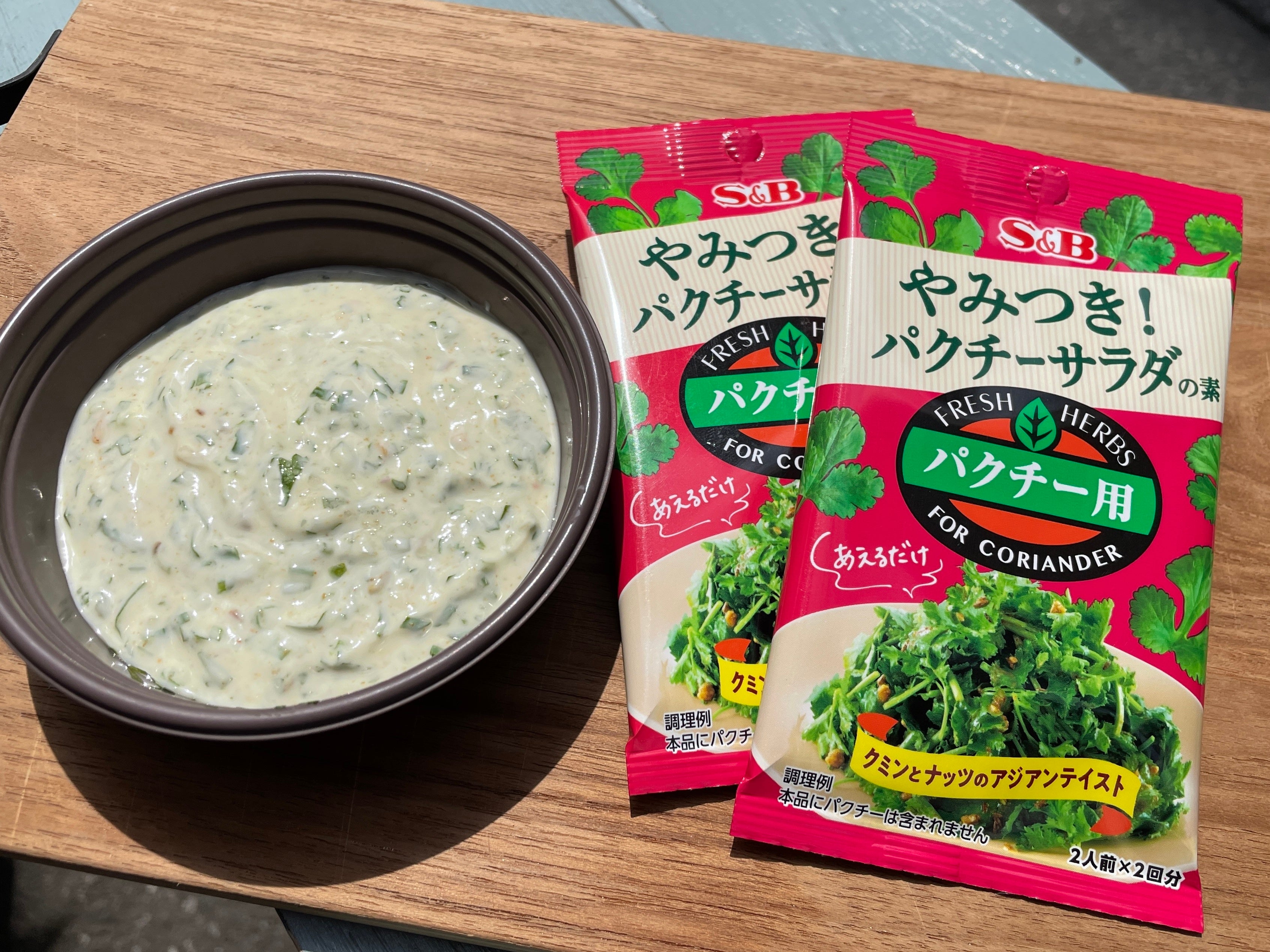 ④サバにピッタリのヨーグルトソースは、きざんだフレッシュパクチーを入れて、さらに「パクチーサラダの素」を追加します。