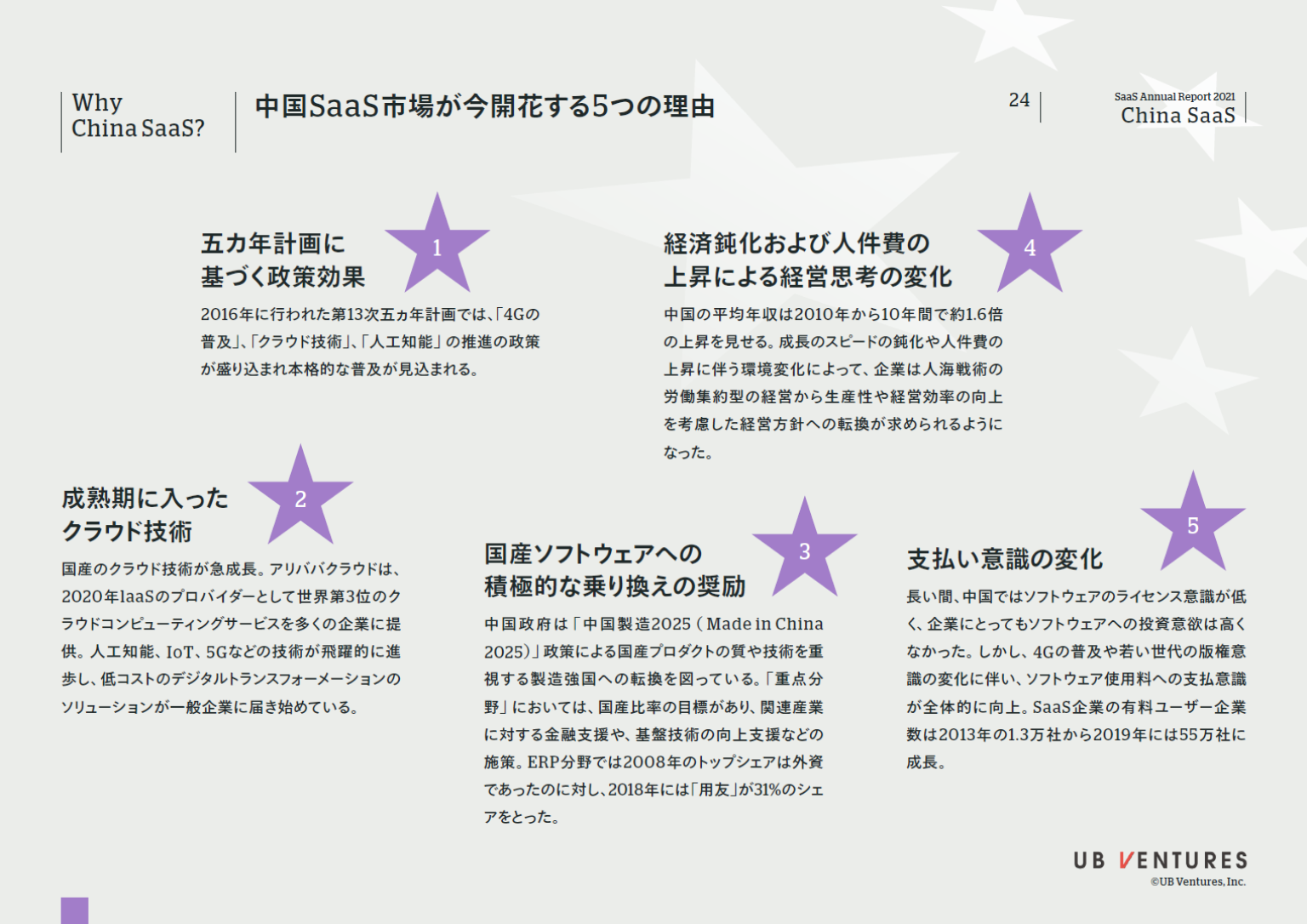 本レポートは、SaaS市場の最新データをまとめた「Overview」、SaaS事業をつくる上での要諦を記載した「Playbook」、2022年の最新トレンドについて説明する「Trend」、急拡大を見せる隣国中国のSaaS市場を分析した「China SaaS」の4部構成となっています。