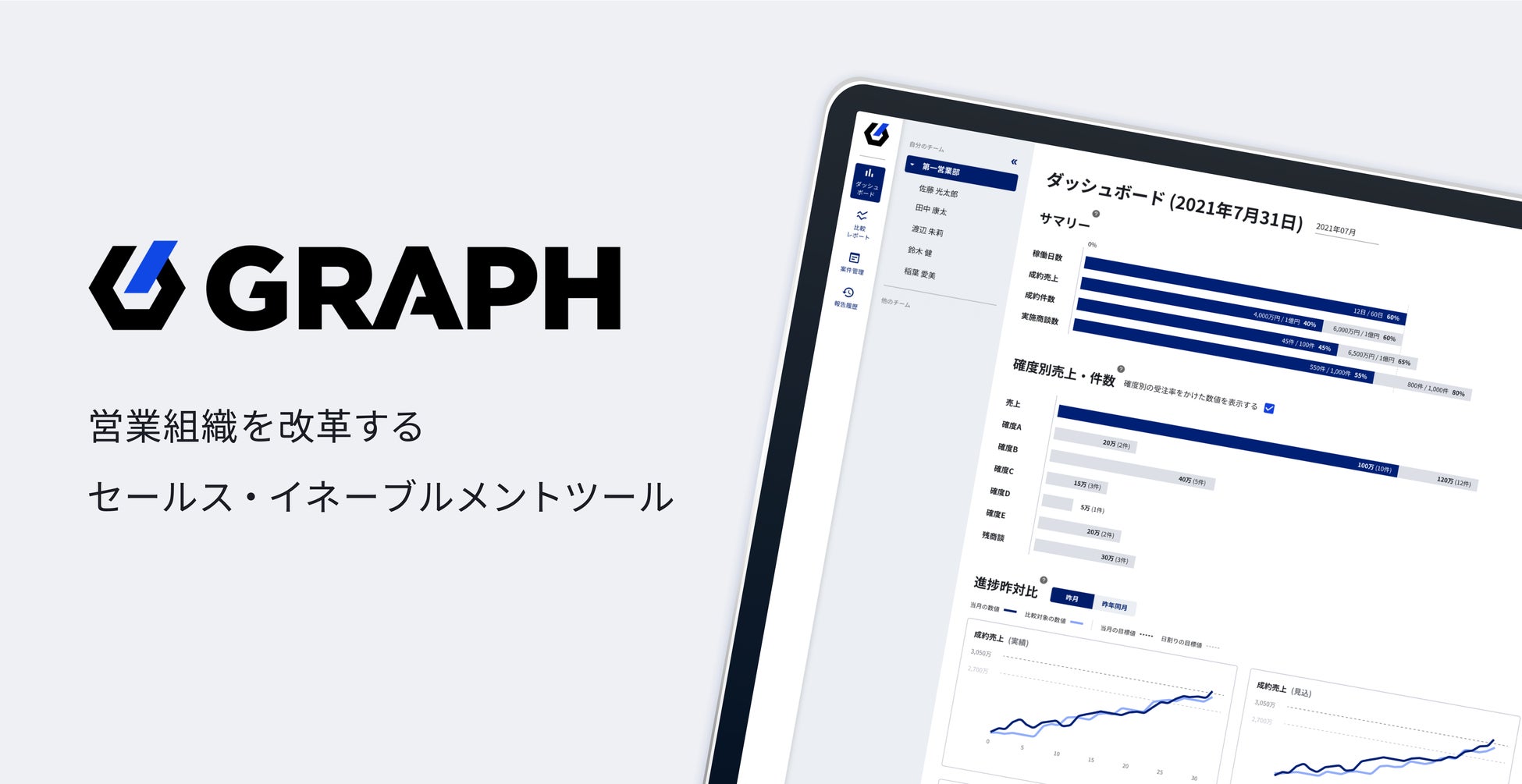 「勝てるチームをつくる」をミッションに、成長企業の目標達成ノウハウを基に開発した、営業組織をデータドリブンに改革するセールス・イネーブルメントツール「GRAPH」を運営。営業エキスパートによるプロフェッショナルサービスと併せ、企業の事業成長・強い営業組織づくりを実現しています。