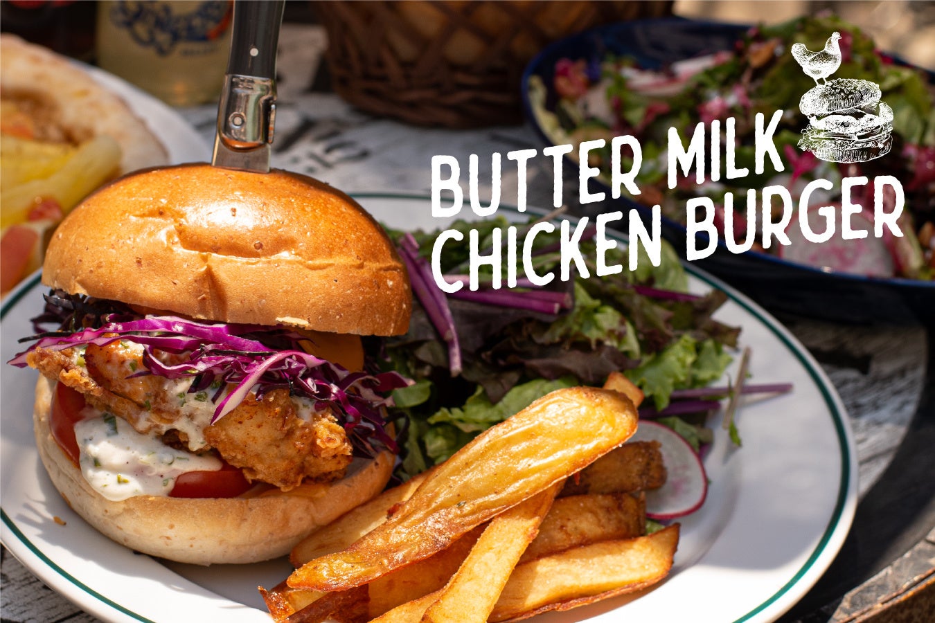 当店名物のチキンをはさんだ絶品バーガー販売!当店名物で大人気のバターミルクフライドチキンを、手軽にお召し上がりいただけるようハンバーガーに!