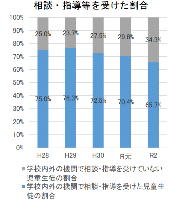 また、不登校児童生徒の割合は2.0%、前年度から14,855人(8.2%)増加。その中で、学校内外での相談・指導の受 けられていない割合は平均して30%ほどです。その原因として貧困が挙げられています。(右図参照)