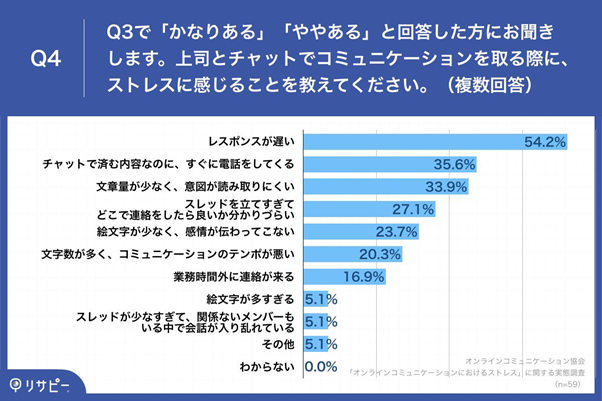 「Q4.Q3で「かなりある」「ややある」と回答した方にお聞きします。上司とチャットでコミュニケーションを取る際に、ストレスに感じることを教えてください。(複数回答)」(n=59)と質問したところ、「レスポンスが遅い」が54.2%、「チャットで済む内容なのに、すぐに電話をしてくる」が35.6%、「文章量が少なく、意図が読み取りにくい」が33.9%という回答となりました。