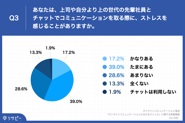 「Q3.あなたは、上司や自分より上の世代の先輩社員とチャット(Microsoft TeamsやSlack、Chatworkなど)でコミュニケーションを取る際に、ストレスを感じることがありますか。」(n=105)と質問したところ、「かなりある」が17.2%、「たまにある」が39.0%という回答となりました。