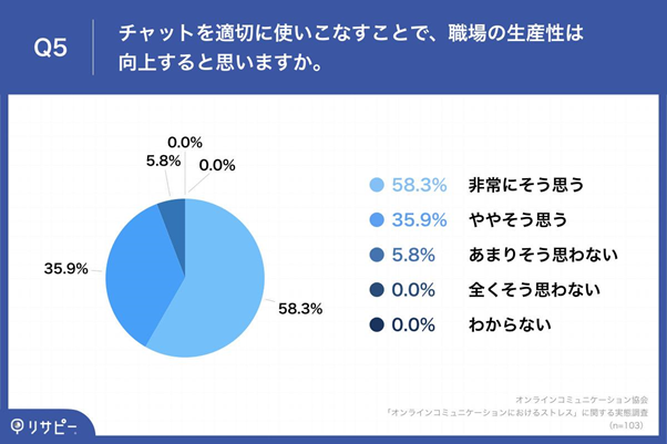 「Q5.Q3で「チャットは利用しない」以外と回答した方にお聞きします。チャットを適切に使いこなすことで、職場の生産性は向上すると思いますか。」(n=103)と質問したところ、「非常にそう思う」が58.3%、「ややそう思う」が35.9%という回答となりました。