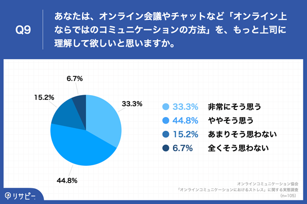 「Q9.あなたは、オンライン会議やチャットなど「オンライン上ならではのコミュニケーションの方法」を、もっと上司に理解して欲しいと思いますか。」(n=105)と質問したところ、「非常にそう思う」が33.3%、「ややそう思う」が44.8%という回答となりました。