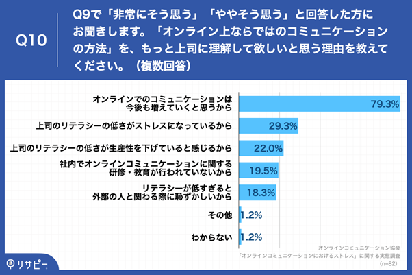 「Q10.Q9で「非常にそう思う」「ややそう思う」と回答した方にお聞きします。「オンライン上ならではのコミュニケーションの方法」を、もっと上司に理解して欲しいと思う理由を教えてください。(複数回答)」(n=82)と質問したところ、「オンラインでのコミュニケーションは今後も増えていくと思うから」が79.3%、「上司のリテラシーの低さがストレスになっているから」が29.3%、「上司のリテラシーの低さが生産性を下げていると感じるから」が22.0%という回答となりました。