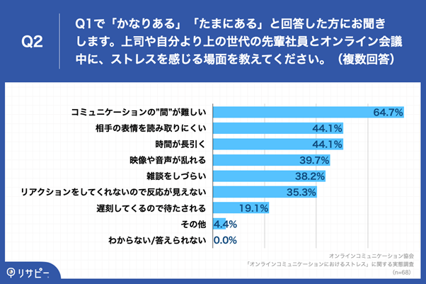 「Q2.Q1で「かなりある」「たまにある」と回答した方にお聞きします。上司や自分より上の世代の先輩社員とオンライン会議中に、ストレスを感じる場面を教えてください。(複数回答)」(n=68)と質問したところ、「コミュニケーションの”間”が難しい」が64.7%、「相手の表情を読み取りにくい」が44.1%、「時間が長引く」が44.1%という回答となりました。