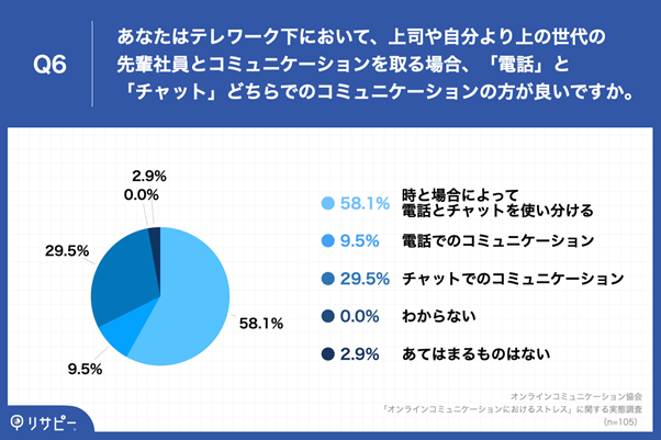 「Q6.あなたはテレワーク下において、上司や自分より上の世代の先輩社員とコミュニケーションを取る場合、「電話」と「チャット」どちらでのコミュニケーションの方が良いですか。」(n=105)と質問したところ、「時と場合によって「電話」と「チャット」を使い分ける」が58.1%、「「電話」でのコミュニケーション」が9.5%という回答となりました。