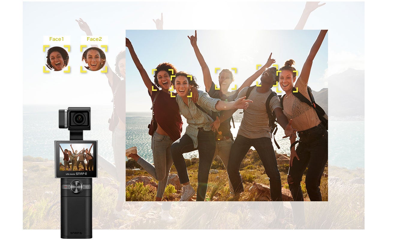 人物はもちろん、ペット等の動き回る被写体でもトラッキング可能なAIによるトラッキングに加え、自分や友人等の顔をSNAP Gに登録して、自動でトラッキングを行うFace ID機能を搭載し、撮影を強力にアシストします。