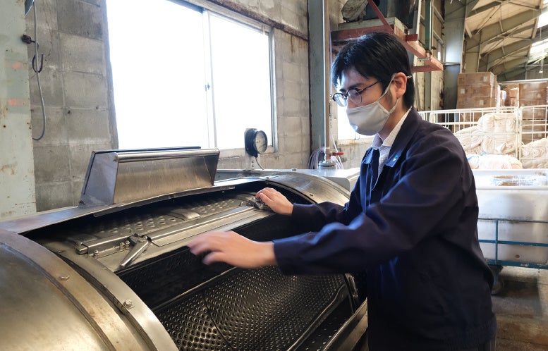 ・仕上げ工程では従来高温の熱湯で洗うところ、一晩かけて低温のお湯に漬け込むことで、コットンへのダメージを少なくしています。
