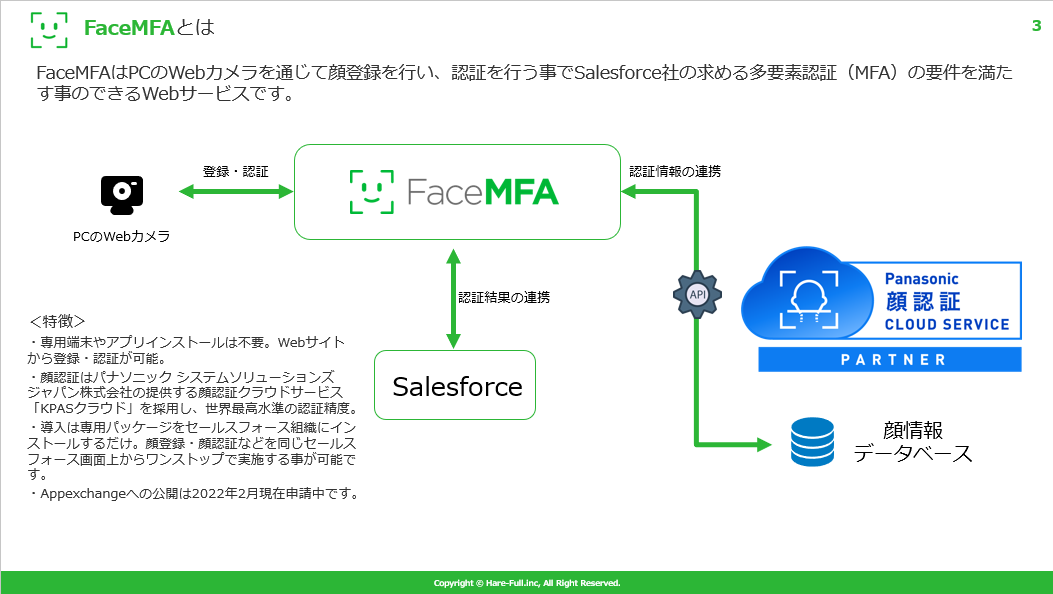 そこで、ハレフルではSalesforceのMFA対応に伴う課題を抱える企業様に向けて「PCのWebカメラだけ」で顔認証を行い多要素での認証を実現するアプリケーション「FaceMFA」の開発を行い、ベータトライアルの募集を昨年12月より実施してまいりました。ベータトライアルで頂いた「もっとユーザに分かりやすく、シンプルに認証・ログインを行いたい」というフィードバックを元に、FaceMFAの改修を実施し、2022年2月15日より正式な販売を開始いたします。